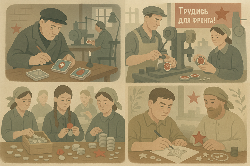 Большая часть тиражей советских военных наград производилась на Ленинградском монетном дворе, который осенью 1941 года был эвакуирован в город Краснокамск Пермской области. Оборудование Монетного двора было размещено в цехах бумажной фабрики «Гознак». Рабочих и инженеров в Краснокамск было эвакуировано всего сорок человек. Проблему кадров пришлось решать на месте. Для работы привлекли женщин и подростков от 14 лет и старше. Отбирали рабочих очень тщательно, нужны были не только сметливые, но и честные рабочие: работать приходилось с большими ценностями. Опытные мастера, прибывшие из Ленинграда, обучали молодых рабочих мастерству монтировщиков, эмальеров, позолотчиков. Благодаря всем этим мерам уже в ноябре 1941 года Монетный двор начал полноценную работу.