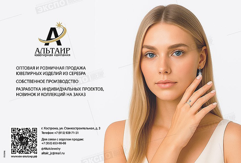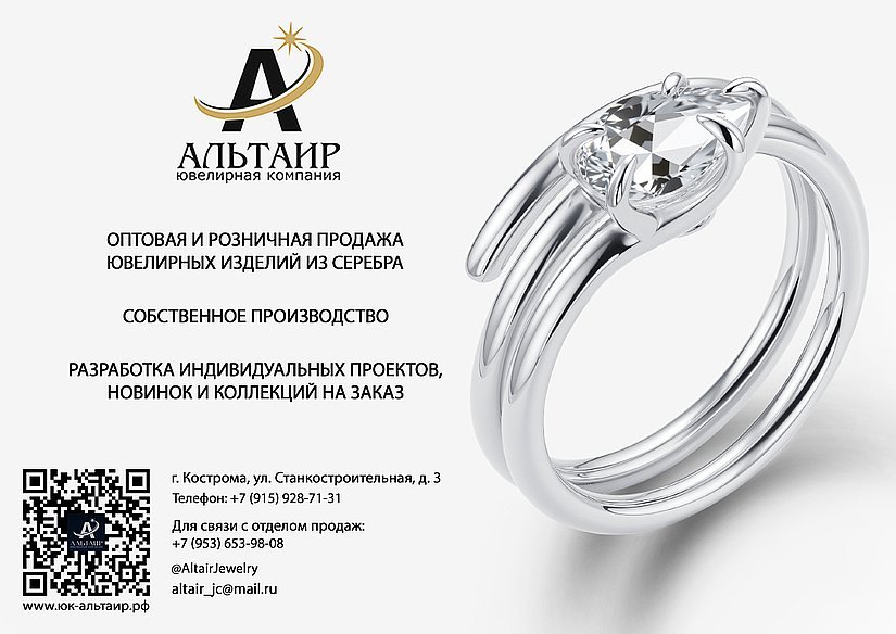 Костромская компания ООО ЮК "Альтаир" – это современный и быстро развивающийся завод-изготовитель. Производство расположено в столице ювелирного мастерства России – Костроме. Нас ценят за высокое качество продукции, индивидуальные условия сотрудничества, конкурентные цены и широкий спектр выполняемых работ во всех направлениях. Ведущие федеральные ювелирные розничные сети заказывают у нас изделия из серебра и бижутерных сплавов.