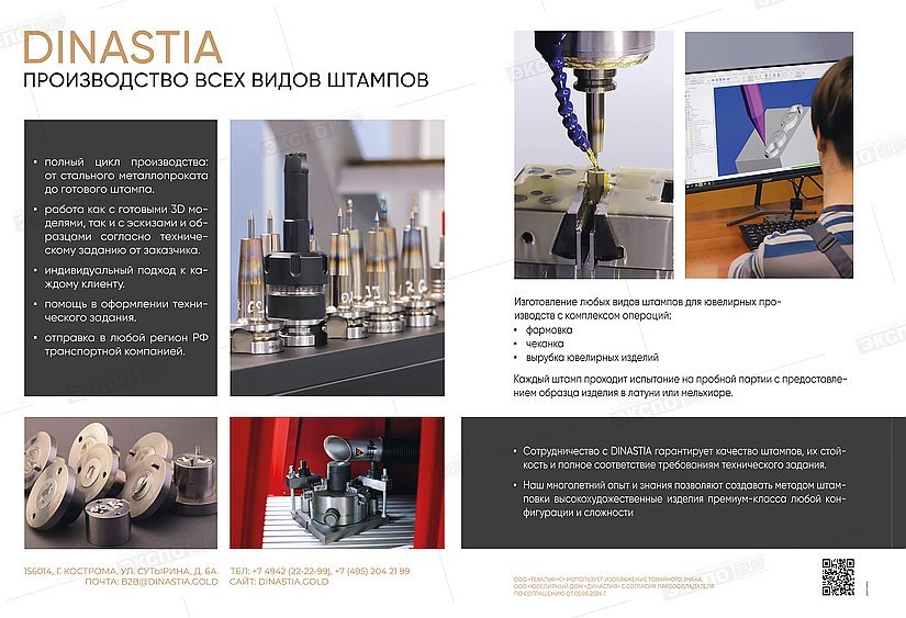Компания "DINASTIA" также занимается производством всех видов штампов для ювелирных изделий. В производственный процесс входит полный цикл: от стального металлопроката до готового штампа. Специалисты компании работают как с готовыми 3D моделями, так и с эскизами, предлагая индивидуальный подход к каждому клиенту.