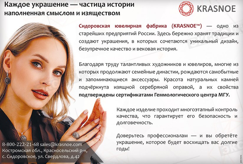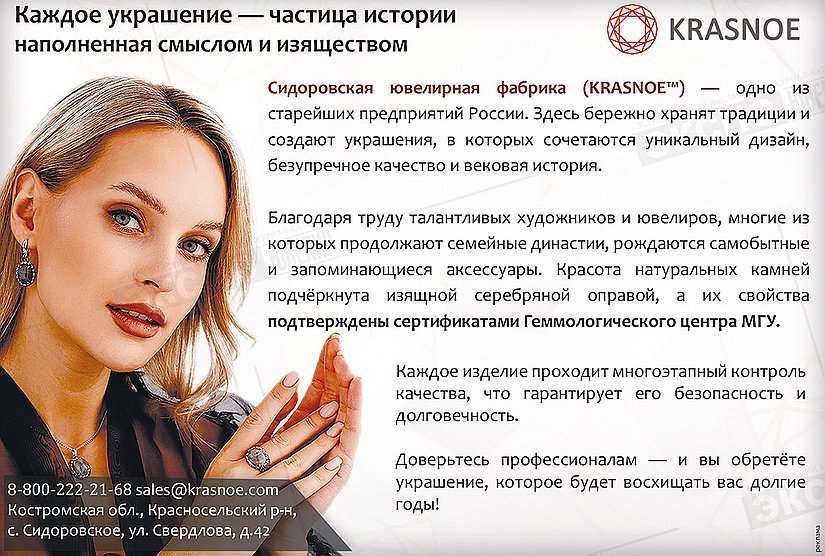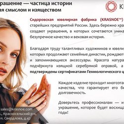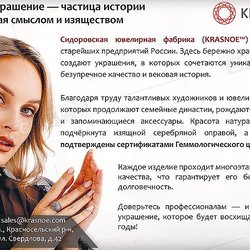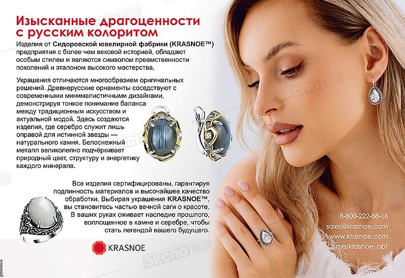 Добро пожаловать в мир роскоши и красоты с ювелирной компанией «KRASNOE»! Наша история началась более века назад, когда на костромской земле была основана Сидоровская ювелирная фабрика. С тех пор мы сохраняем традиции мастерства, создавая уникальные произведения искусства, которые продолжают восхищать людей по всему миру.