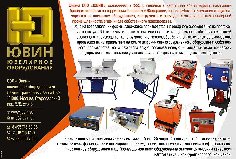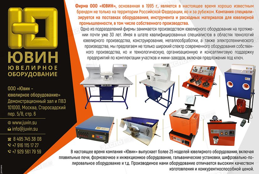 ООО "ЮВИН - ювелирное оборудование" основана в 1995 г. Фирма специализируется на поставках оборудования, инструмента и расходных материалов для ювелирной промышленности. Одно из подразделений фирмы занимается производством ювелирного оборудования. Нашими клиентами являются фирмы самых разных масштабов - от небольших кампаний до крупных промышленных предприятий. Каждому клиенту мы предлагаем оптимальное решение. Имея в штате квалифицированных специалистов в области технологий ювелирного производства, мы предлагаем не только широкий спектр современного оборудования, но и технологическую, организационную и консалтинговую поддержку предприятий по комплектации участков и мини-заводов, включая предложения "под ключ".