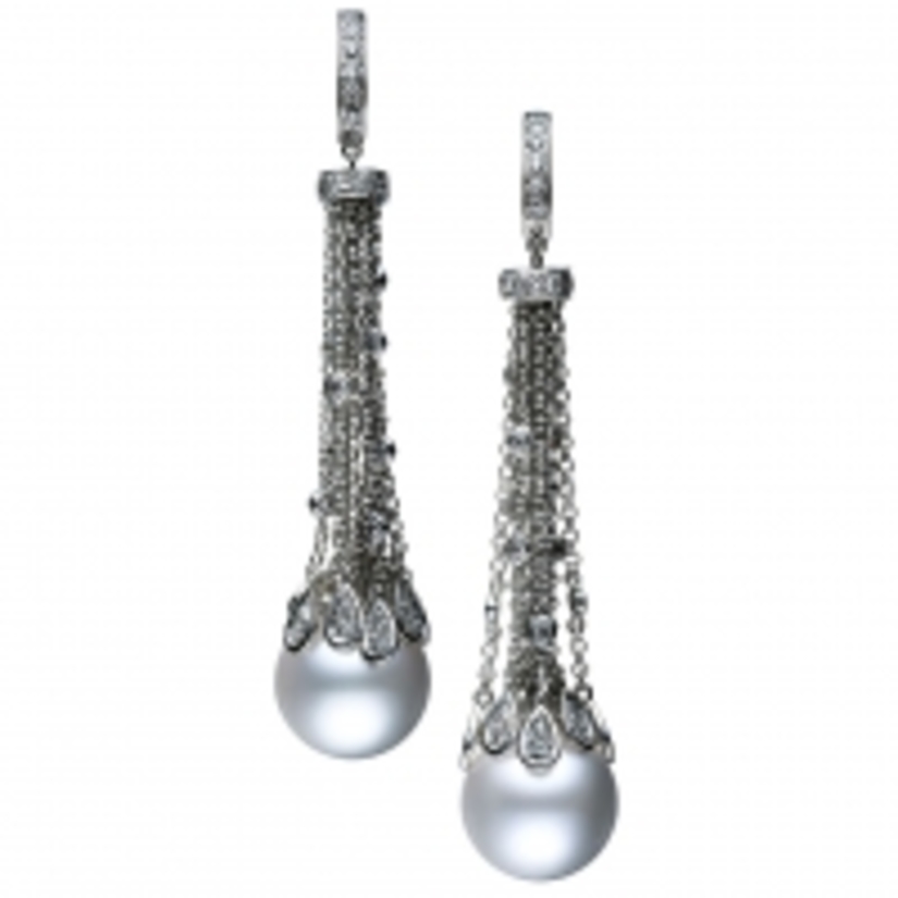 Подвешенные к свободно движущимся, усыпанным бриллиантами цепочкам из белого золота 750 пробы, идеальные круглые культивированные жемчужины размером 13-14 мм удерживаются в подвеске гроздью бриллиантов, которые расположены в случайном порядке (или нарочито расположенные так, чтобы порядок казался случайным).