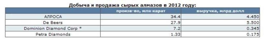 De Beers - единственная не торгуемая на бирже компания, но акции других: Petra Diamonds и АЛРОСА, торгуются в Лондоне и на Московской бирже соответственно. С начала года, акции АЛРОСА прибавили в цене более 7%, а Petra Diamonds - более 4%. Акции Dominion Diamond торгуются на канадской бирже в Торонто, и их слабо отрицательная динамика не может служить показателем для рынка, так как они еще находятся под влиянием сделки, заключенной в начале года между Harry Winston и Swatch *.