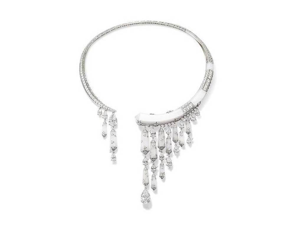 С другой стороны, было бы не совсем верно аттестовать украшения Lumiere d'Eau только лишь как классические образцы ампира. В этих драгоценностях довольно лукавой французской игры любви и случая. Клер Деве-Ракофф сочетает элементы ампира с деталями ар-нуво, к которым стоит отнести и драгоценные помпоны, созданные из сапфировых бусин, и композиции в форме загадочных раковин. Флагманской драгоценностью (если исключить тиары, предмет исторически необычайно важный для Chaumet; в этом доме никогда не переставали изготавливать драгоценности для головы и прически, хотя такие вещи много раз выходили из моды) следует считать харизматичное короткое колье в форме знака вопроса. Это украшение, которое, собственно, и наследует исторической тиаре дома "Водопад", сделано из белого золота, с белыми бриллиантами и полупрозрачным горным хрусталем. Хрустальные подвески разного размера закреплены на твердом золотом "ошейнике" и все вместе образуют некий причудливый занавес, такую непроницаемую толщу драгоценного водопада. В этой прекрасной вещи Chaumet есть что-то невероятно мучительное, но эта мука истинной ювелирной красоты, красоты очень сложной, непонятной, неясной, невыразимой. Собственно, это не совсем украшение, скорее это настоящий драгоценный символ начала трагического и необъяснимого XX века.