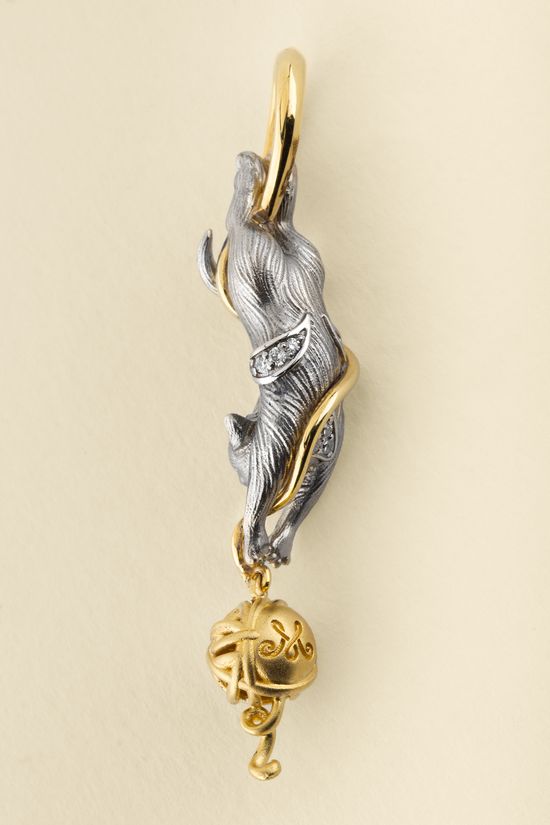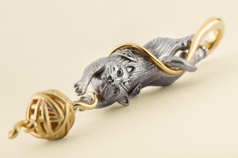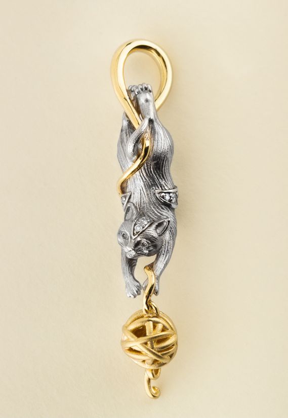 Милый и озорной котёнок свисает с цепочки, пытаясь грациозно дотянуться до своего клубка. Тонкая золотая нить обвивает его и образует подвесное ушко кулона. Клубок же подвешен на колечке, благодаря чему он может раскачиваться, заигрывая с котёнком. Кулон с котёнком непременно вызовет восторг и станет любимым украшением у его обладательницы. Вставки: бесцветные бриллианты круглой огранки 3/5 0,02 сt (1 мм 5 шт), 0,64 сt (1,2 мм 8 шт)