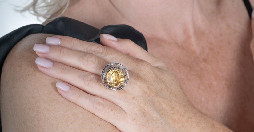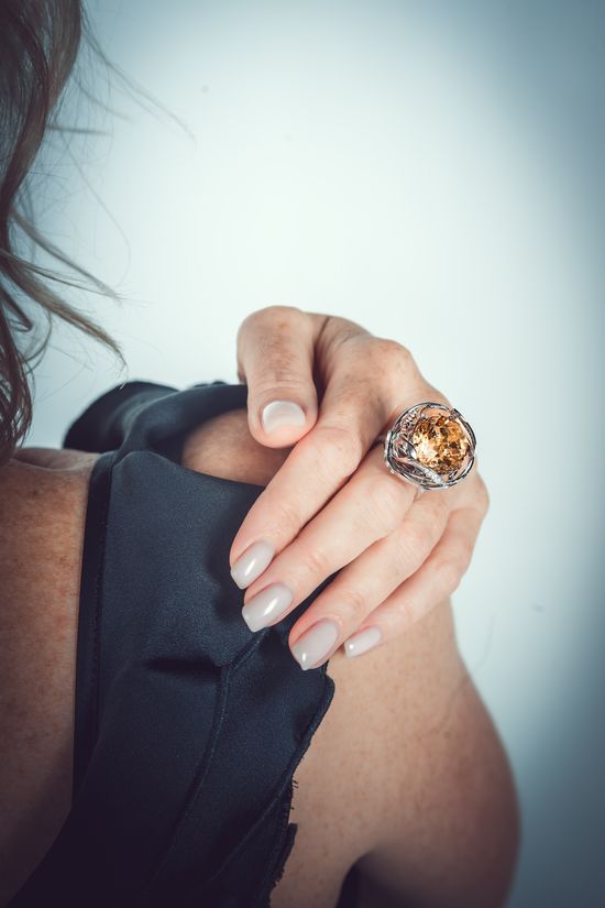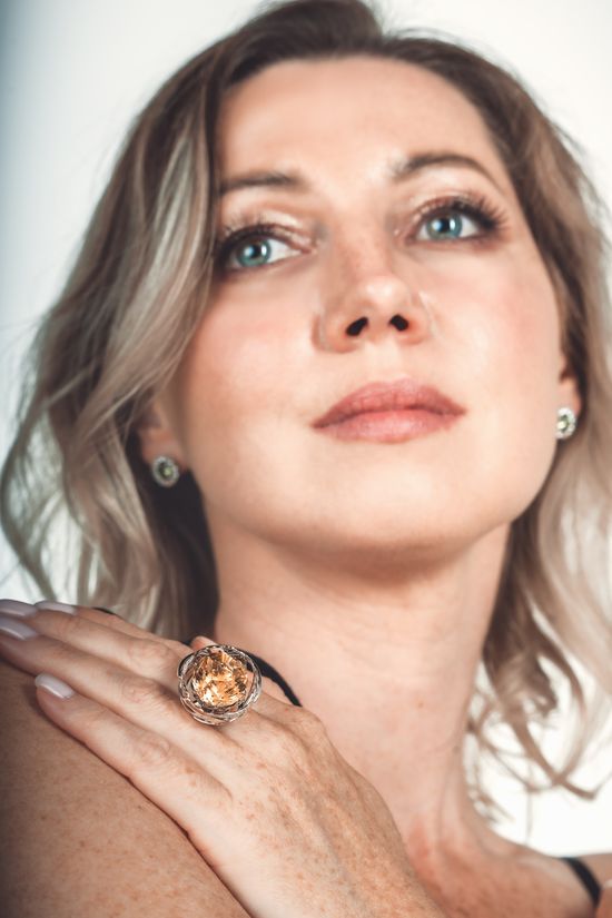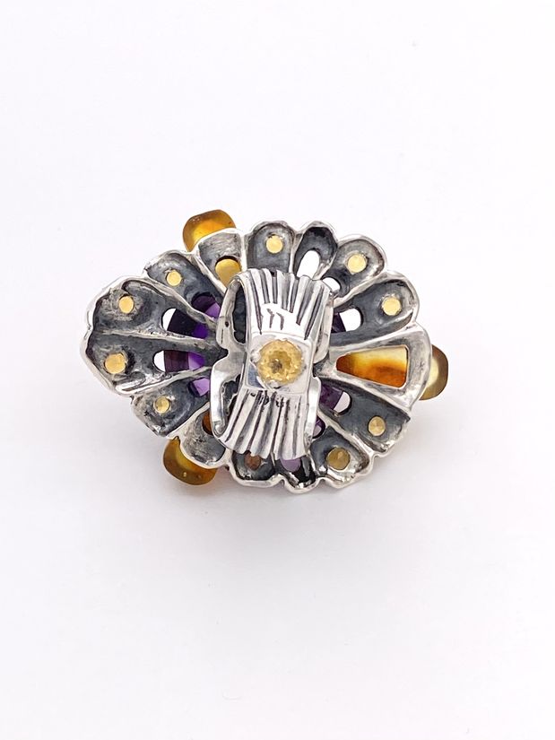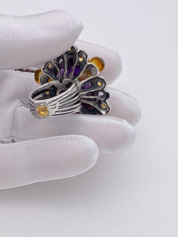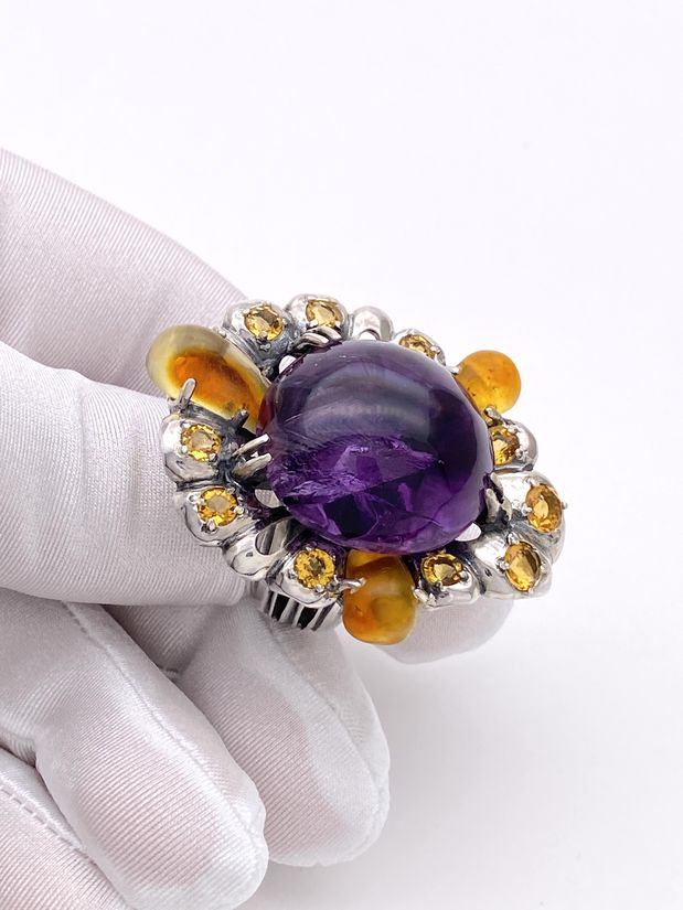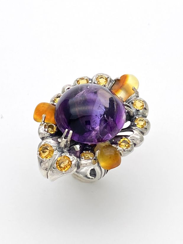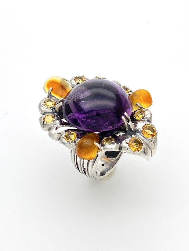 Кольцо, как капля солнечного ритуала. В самом центре — глубокий аметист, как затопленный колодец мысли. Вокруг него — янтарь, будто застыла тёплая кровь дерева, и цитрины, сияющие как солнечные искры на воде. Это кольцо — не просто украшение. Это почти артефакт: сплав света и тени, металла и времени. Оно о том, как переплетаются стихии. Как в одном предмете уживаются прозрачность янтаря, ночная глубина аметиста и светлая острота цитрина. Создано вручную. Из серебра. С вниманием к деталям и характеру. Потому что каждое кольцо — это не только жест вкуса, но и способ говорить без слов.