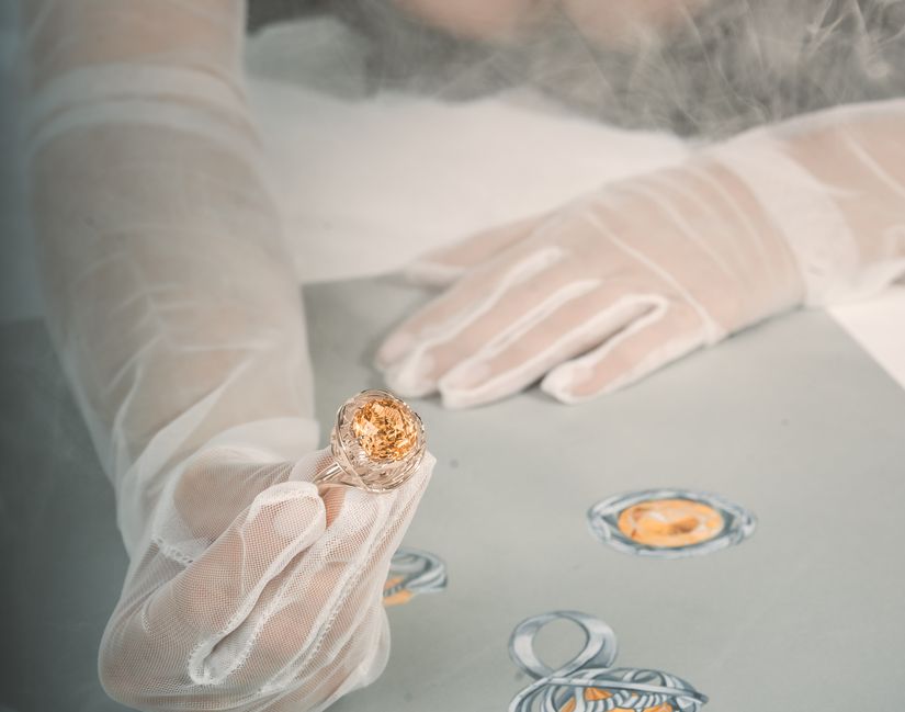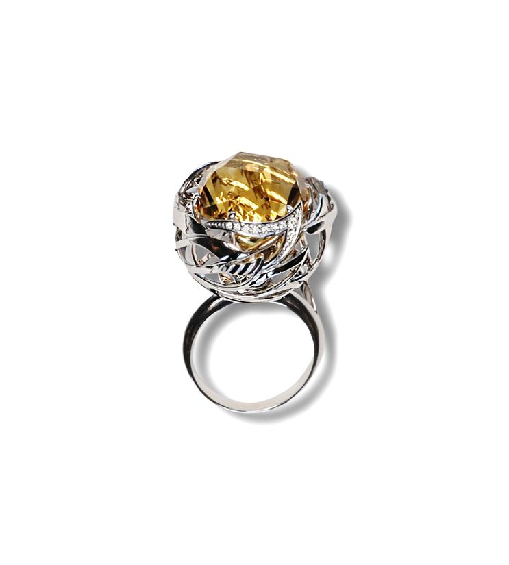 Коллекция Оксаны Фомченковой ПУТЬ – ПОЛЕТ Центральный камень – цитрин фантазийной огранки с раскрывающимся цветком. Верхняя часть кольца– бриллианты: 0.9 мм- 2 шт 1.0 мм– 4 шт 1.1 мм – 6 шт 1,2 мм – 1 шт 1,5 мм - 2 шт 1,7 мм -1 шт На подъеме шинки – лейкосапфиры багеты 4 шт 3*1,5 мм