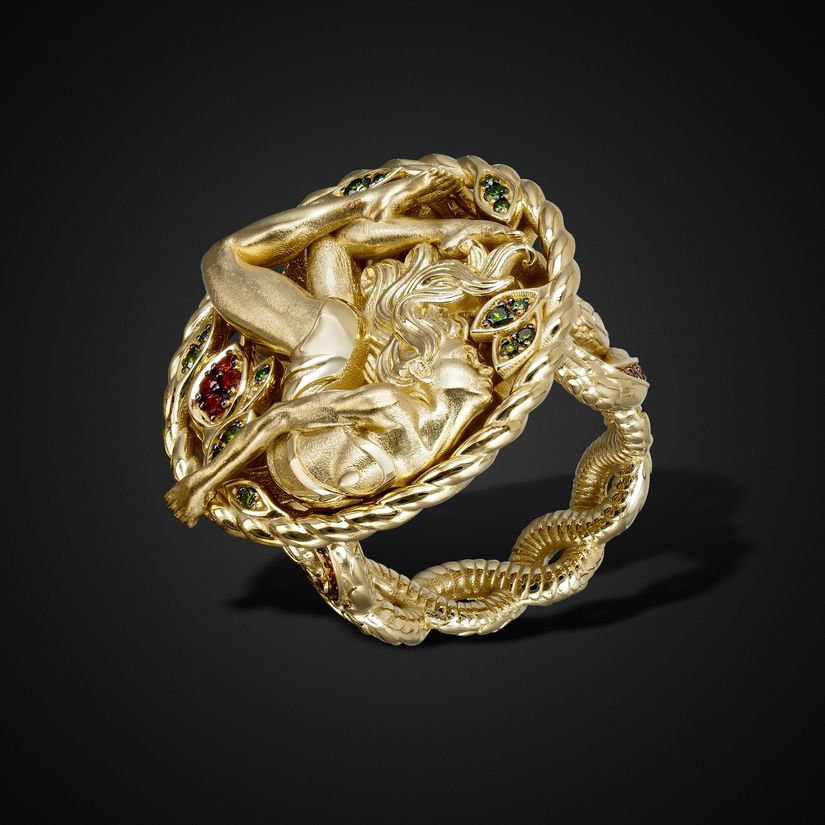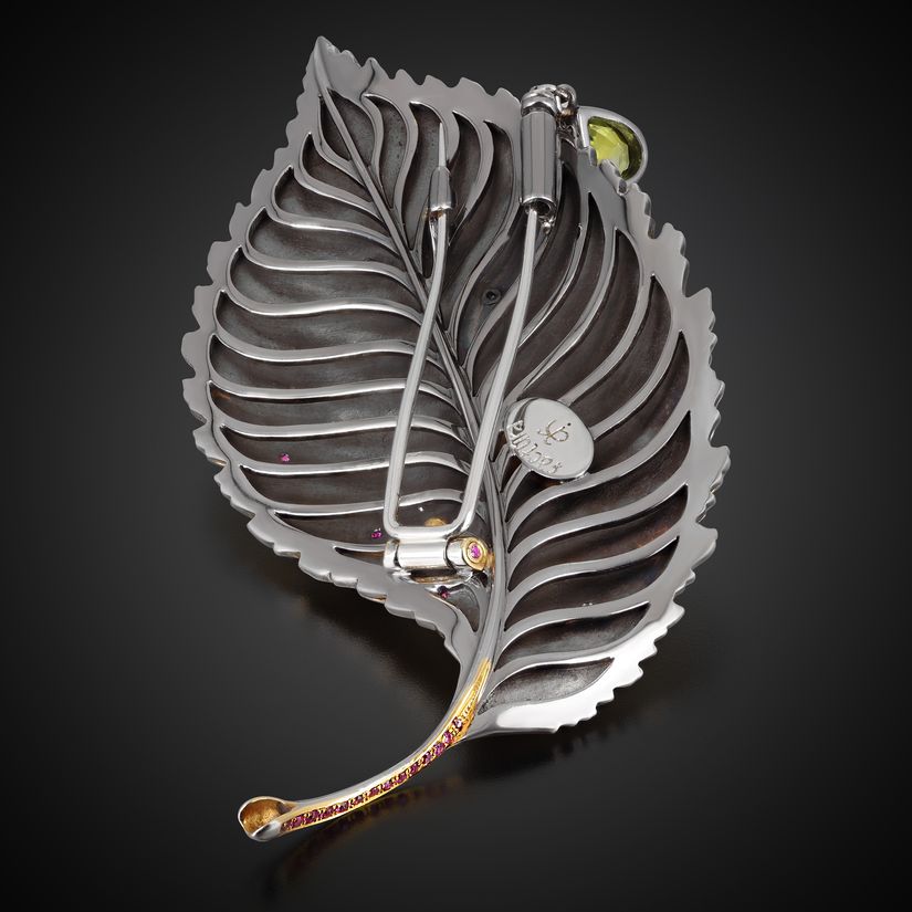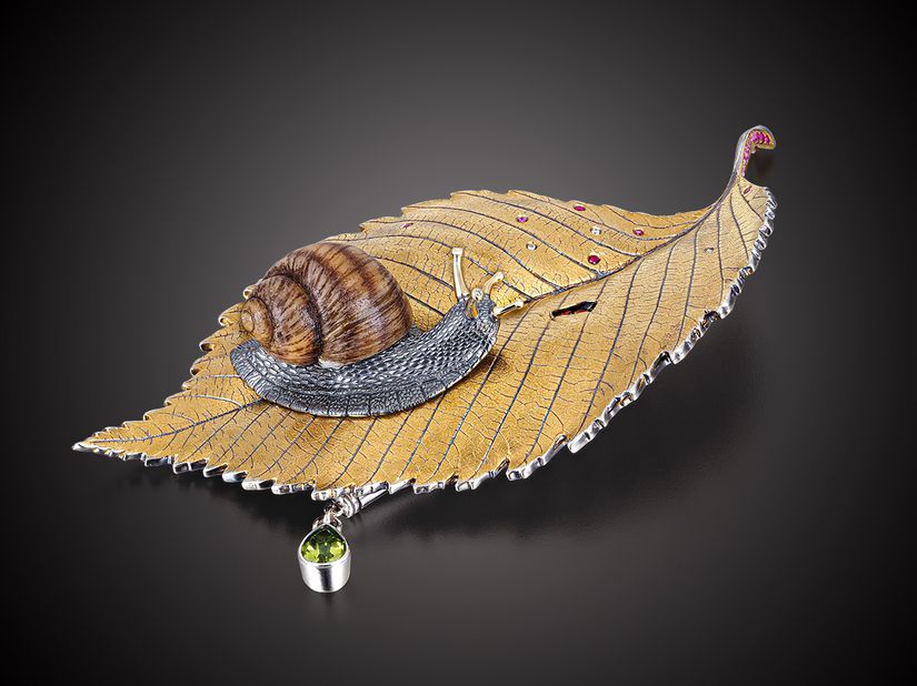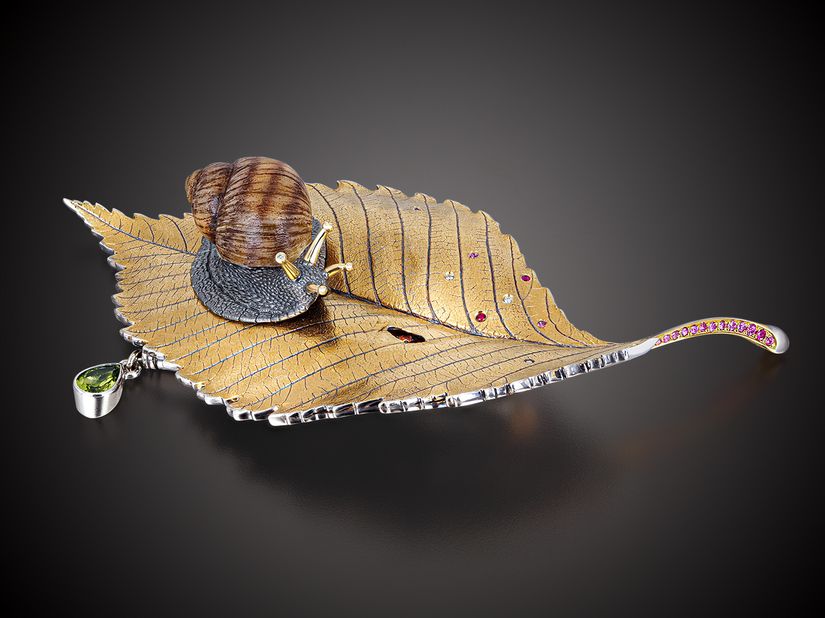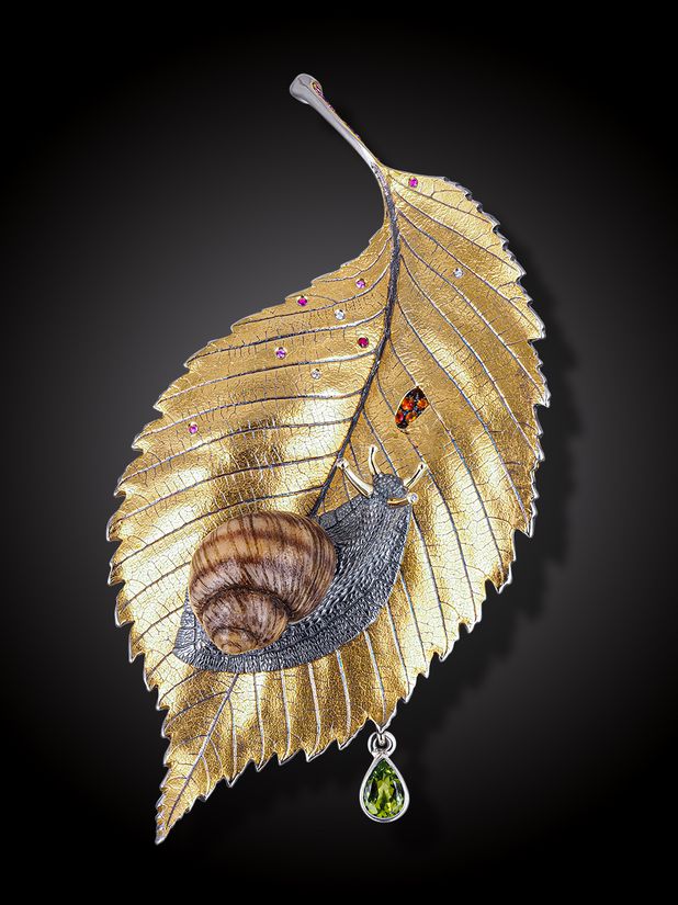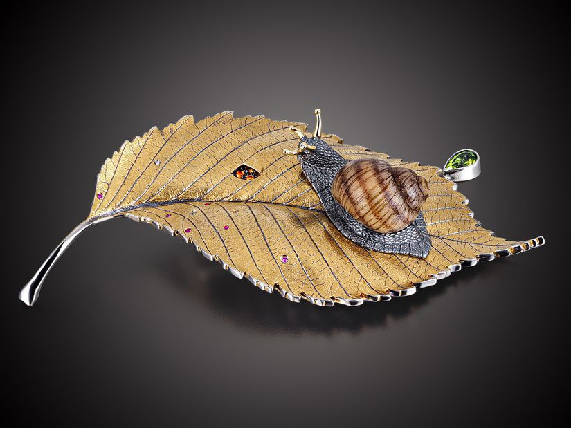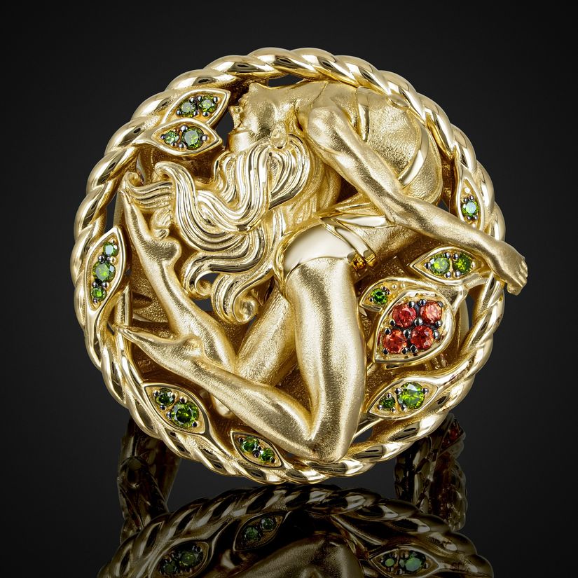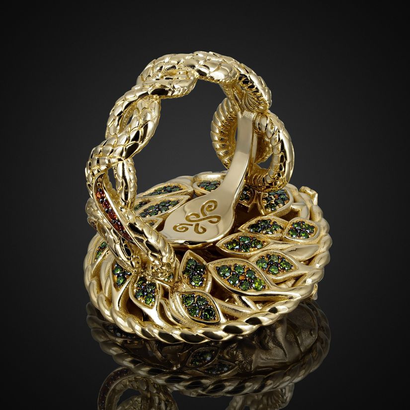 Вставки: Хризолит, розовый сапфир, оранжевый сапфир, бриллиант, стабилизированная раковина улитки. Информация об изделии: Резьба по воску, литье, чеканка, гравировка, выпиловка и другие классические ювелирные техники ручной работы. Позолота, черный родий, белый родий.