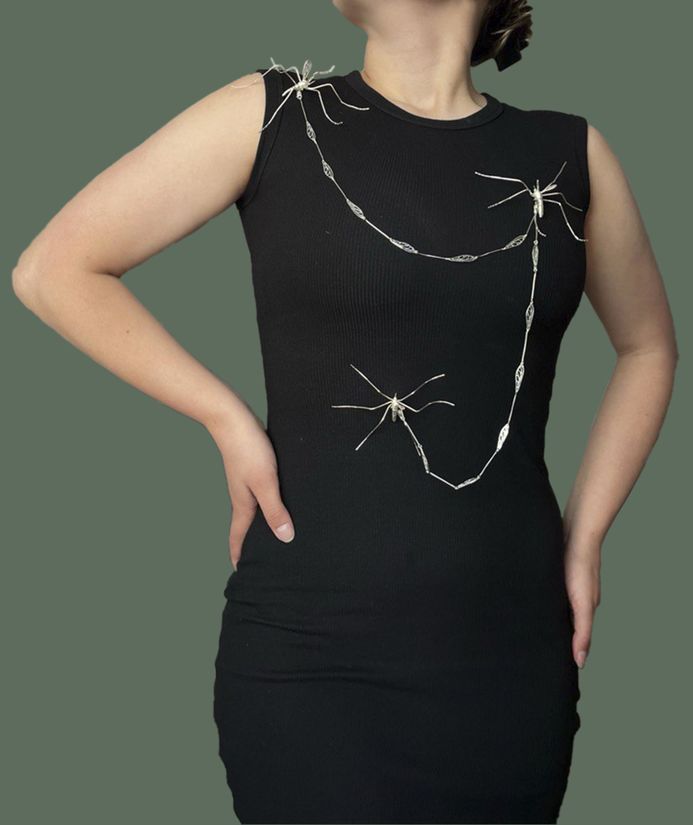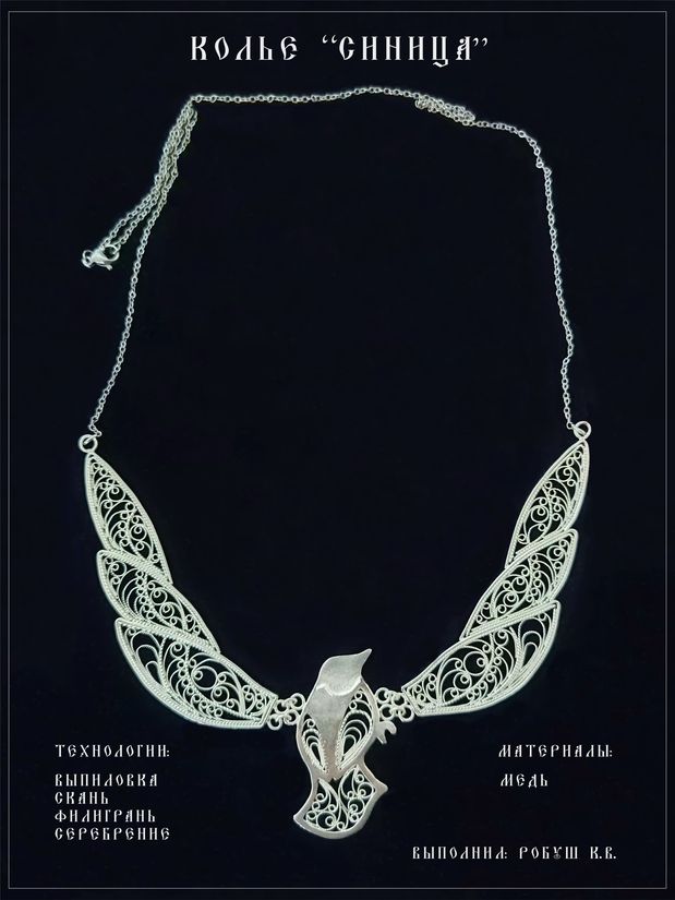 Идеей для колье «Синица» послужила грация птичьего полета, вдохновленная образом синицы, одной из самых узнаваемых птиц России. В народе данная птица приносит удачу и счастье, а в славянской традиции синица ассоциируется с солнцем, теплом и надеждой на лучшее. Каждое переплетение филигранных нитей и изгиб металла, передает лёгкость крыльев, подвижность и игривый характер птицы. В эпоху, когда ценится индивидуальность и связь с культурными традициями и корнями, данное ювелирное изделие становится особенно актуальным. Колье передаёт важность простых радостей жизни, символизирует оптимизм и веру в светлое будущее. Колье идеально подойдет для тех, кто ценит красоту, которая окружает нас каждый день; стремится к гармонии с природой и желает добавить в свой образ нотку русской души. Технологии: выпиловка, скань, филигрань, серебрение