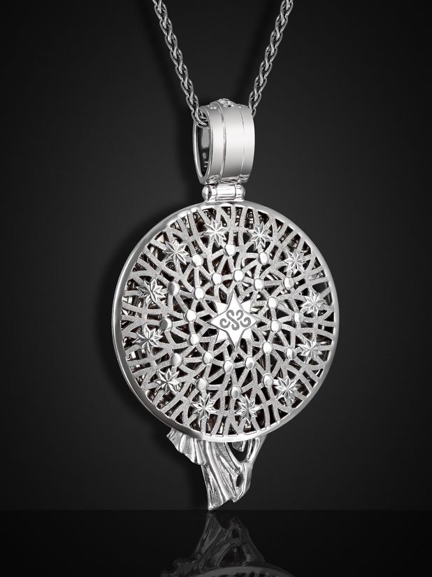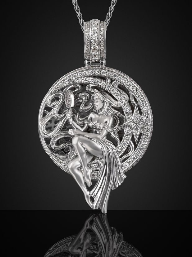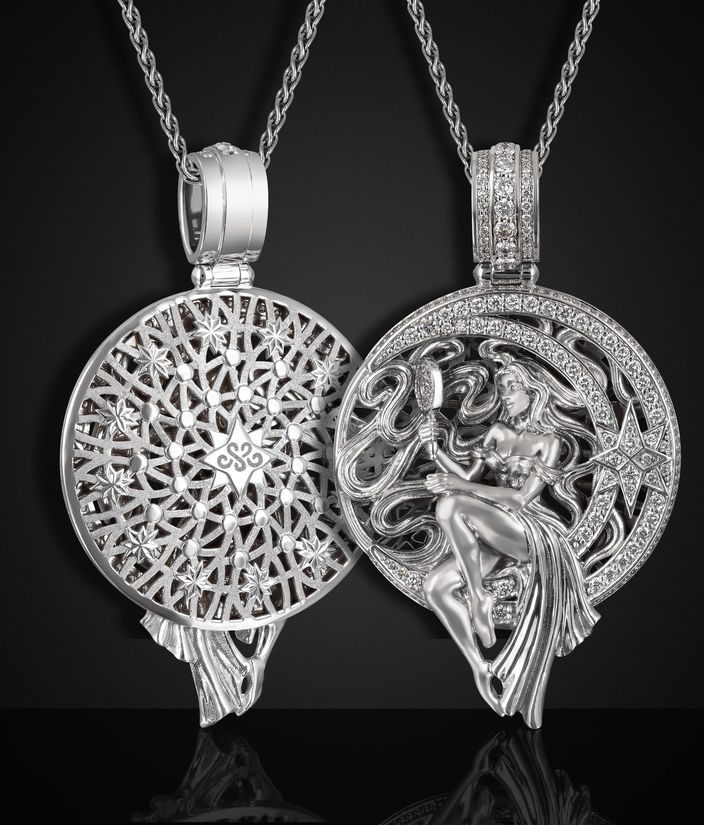 Когда ночь окутывает город и заботы уходят на второй план, Влюбленный грезит о своей единственной, самой чистой и идеальной из всех. Он представляет её женственную фигуру в тонком струящемся платье. Вдыхает аромат её волос, ласкаемых теплым ветром. Он, наконец, замирает от одного лишь её взгляда, достойного всех звезд этого залитого лунным светом неба… Она – Богиня его ночных грёз. Для исполнения кулона мы выбрали белое золото и бриллианты, а также использовали технику родирования ярко-белым родием, чтобы передать атмосферу лунной ночи, как символа чистоты чувств Влюбленного к своей Богине. Вставки: Бриллианты круглые 3/5 0,198 ct (0,7 мм 79 шт), 0,012 ct ( 0,8 мм 4 шт), 0,16 ct (1 мм 32 шт), 0,036 ct ( 1,2 мм 4 шт), 0,615 ct (1,4 мм 41 шт), 0,315 ct (1,9 мм 9 шт)