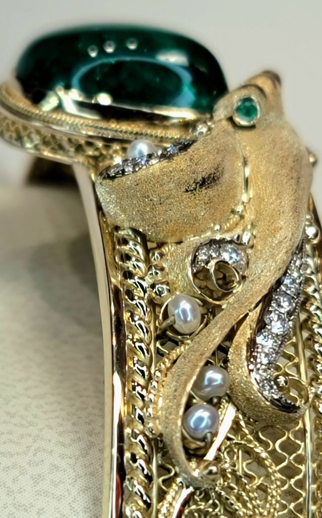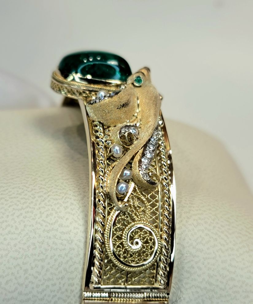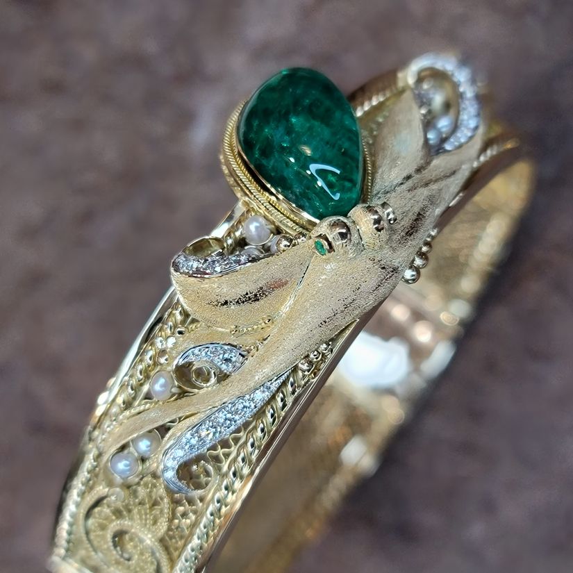 Художник-ювелир. Звание присвоение ГОХРАНом. Российский ювелирный бренд "Геннадий Ладонов". Опыт работы в ювелирной отрасли более 35 лет. Много лет состоял в творческом союзе художников России. Участвовал в различных выставках от "Симфония самоцветов" до внутренних выставка в Государственной думе. Свою творческую деятельность начал в конце 80х. Создавая украшения для творческой интеллигенция Дома Архитекторов, Дома литераторов. Участвовал в совместных проектах с модельерами Дорой Бланк, Милой Надточий. В 90-е годы руководил ювелирной творческой фирмой "Крин", в середине 2000-х работал Художником ювелиром в государственной компании "Мосгорломбард". Учился в мастерской на кафедре графики в Строгановском училище. Поскольку работаю только с частными заказчиками и создаю для них коллекции, то обладаю всеми приёмами ювелирного ручного мастерства, кроме 3D моделирования. Вдохновение черпаю от человека, ведь каждый заказчик это мир с своим видение прекрасного в ювелирном искусстве. Каждая новая работа начинается с обсуждения и пожеланий клиента. Далее наброски, эскизы, поиск необходимых камней и варианты техники исполнения. Всегда загружен индивидуальным заказами, поскольку даже на выставках все труднее встретить что-то эксклюзивное. А заказчик, участвуя в творческом процессе получает удовлетворение и радость, создавая что завешенная работа будет его радовать долгие годы. Я же работая с такими заказами получаю и вдохновение расширяются свои знания технические приёмы.. Браслет "Осьминог " исполнен вручную, все элементы изделия изготовлены только моими руками, в нем представлены наиболее часто используемые мной техники: Скань-филигрань, чеканка, шелкография, фактурирование, монтировать, закрепка камней и т.д. Золото 585-750 пробы 46,08гр., уральский изумруд кабошон 10,5 кт., бриллианты 37 шт., речной жемчуг. Я считаю, что настоящий художник- ювелир для создания ювелирного украшения обязан отталкиваться не от своих технических возможностей и навыков, а от идеи, эскиза, где порисовать все элементы будущего украшения и только в последнюю очередь думать в какой технике и как реализовать в металле, материале, все то, что нарисовано на бумаге. А для этого нужно учиться всю свою творческую жизнь всевозможные приемам и техника ювелирного мастерства.