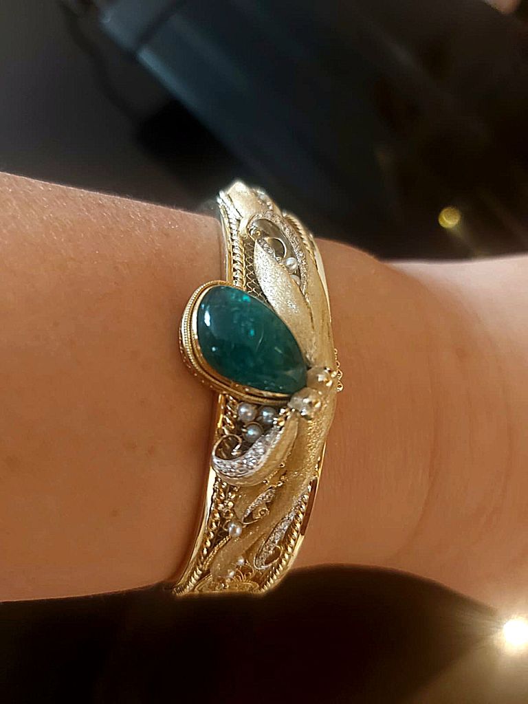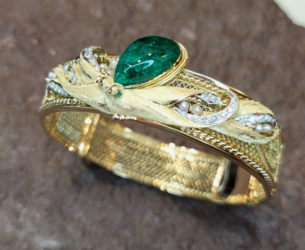 Золото 585-750 пробы 46,08 гр., уральский изумруд кабошон 10,5 кт., бриллианты 37 шт., речной жемчуг. Браслет изготовлен вручную без применения 3D технологий, от рукописных эскизов до воплощения в металле. Для создании браслета применены наиболее часто используемые автором техники: скань-филигрань, фактурирование, шелкография, монтировка, чеканка, зернь, закрепка и пр.