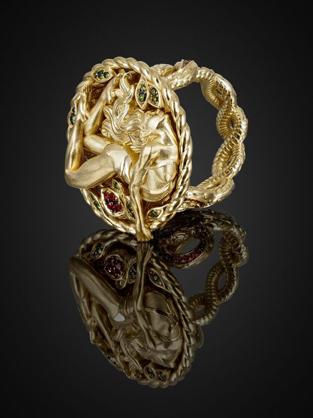 Гармония с телом и окружающим миром акробатки вдохновили нашего Мастера на создание этой коллекции украшений. Невероятная гибкость и красота фигуры девушки безусловно приковывают взгляды. Но в ней есть еще кое-что особенное – это радость жизни и наслаждение каждым днём. Об этом нам говорят её воздушные волосы, ласковые руки, добрый взгляд и растения, окружающие акробатку. Змей, как символ земли и природы в целом, еще раз подчеркивает гармоничные отношения между ней и миром вокруг. Кольцо красиво, с какой стороны вы бы не обратились к нему. Фигура акробатки объёмная, поэтому внутренняя сторона украшения является полноправной частью всей картины. Вставки: Бриллианты зеленые круглые 5/3: 0,07 Ct ( 1 мм - 15 шт), 0,36 Ct ( 1,1 мм - 54 шт), 0,145 Ct ( 1,2 мм - 18 шт), 0,1 Ct ( 1,3 мм - 10 шт), 0,18 Ct ( 1,3 мм - 12 шт), 0,045 Ct ( 1,7 мм - 2 шт). Сапфиры оранжевые круглые: 0,1 Ct (1мм 18 шт), 0,035 Ct (1,1 мм 4 шт), 0,045 Ct (1,2 мм 4 шт), 0,085 Ct (1,5 мм 4 шт)