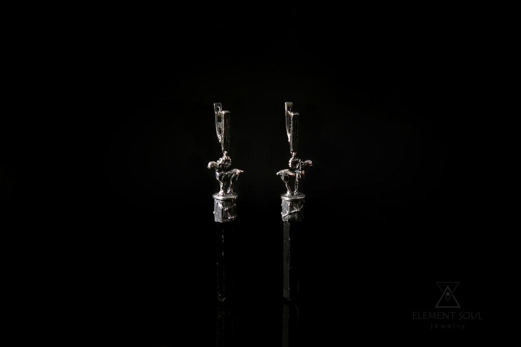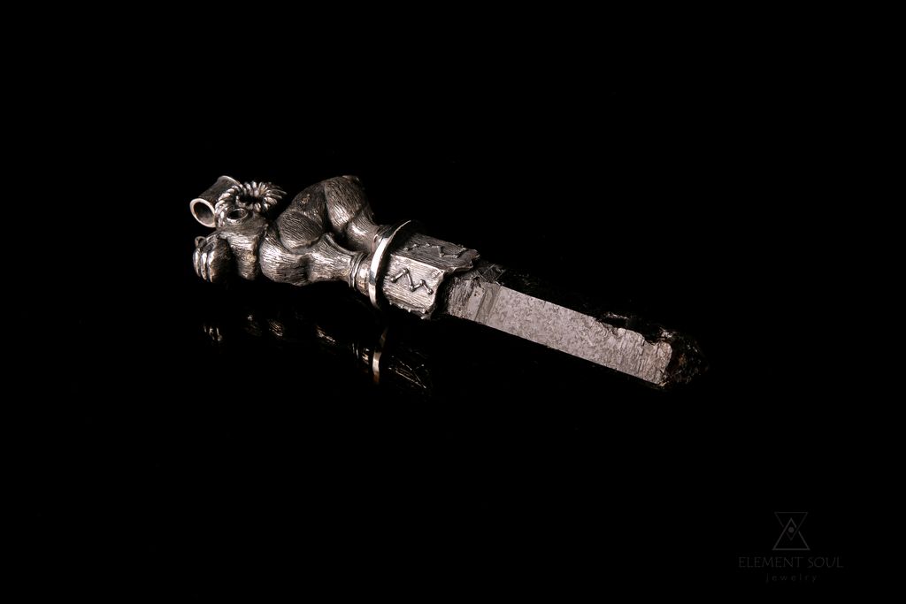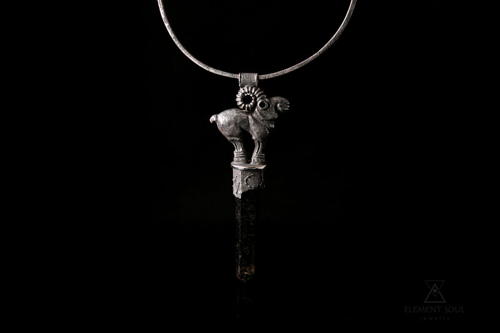Комплект выполнен в серебре 925 пробы со вставками природных кристаллов мориона. Выполнены стилизованные изображения архаров и изображения созвездий. Гривна так же выполнена в серебре с гравировкой по кругу в виде стилизованного звериного стиля (изображения животных Сибири).