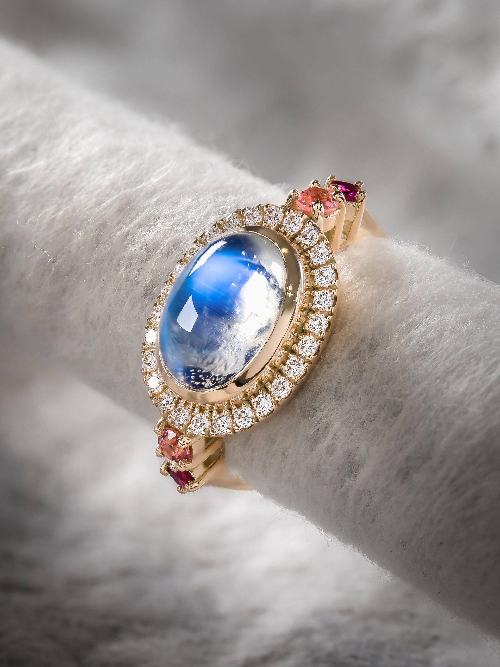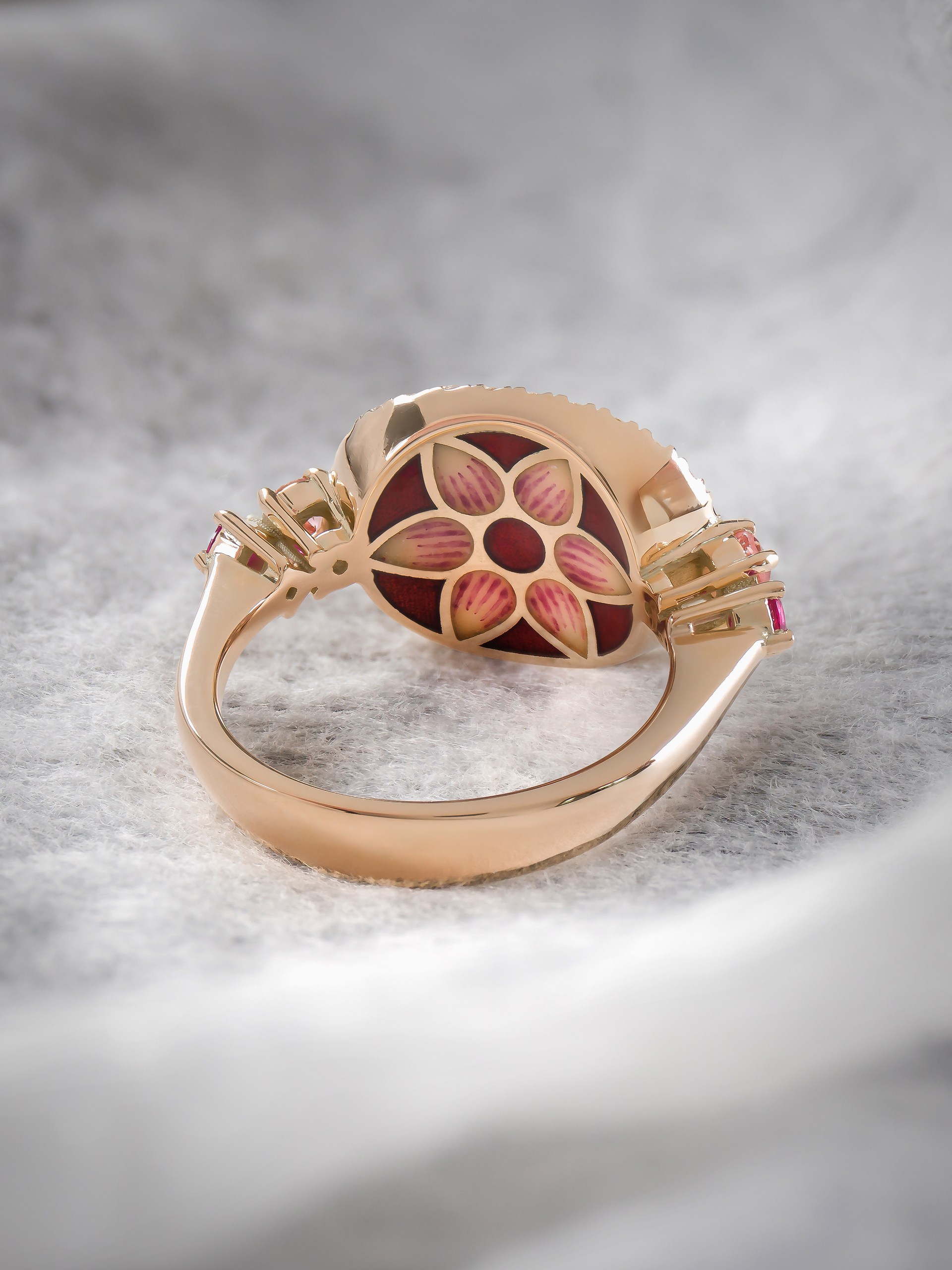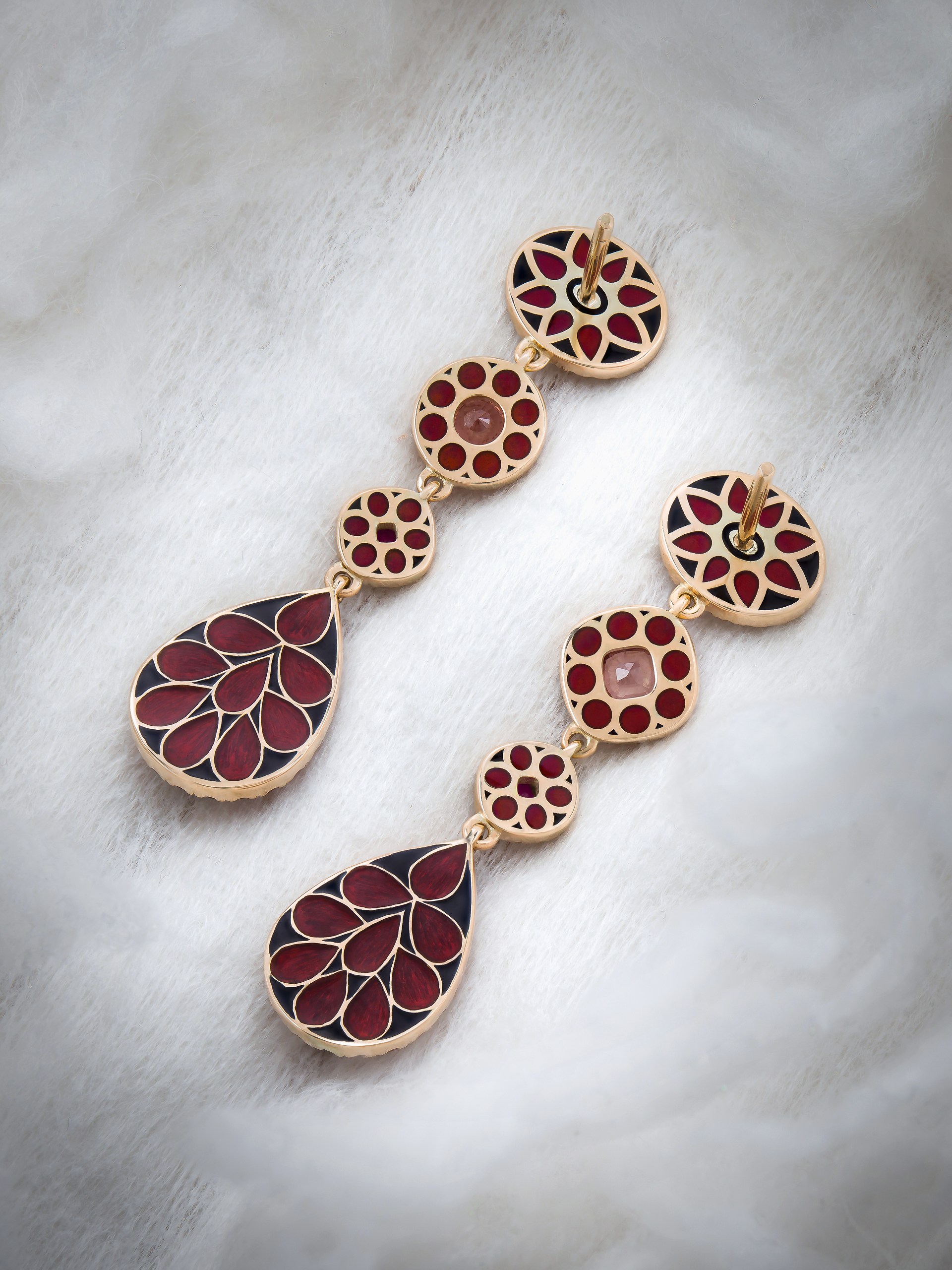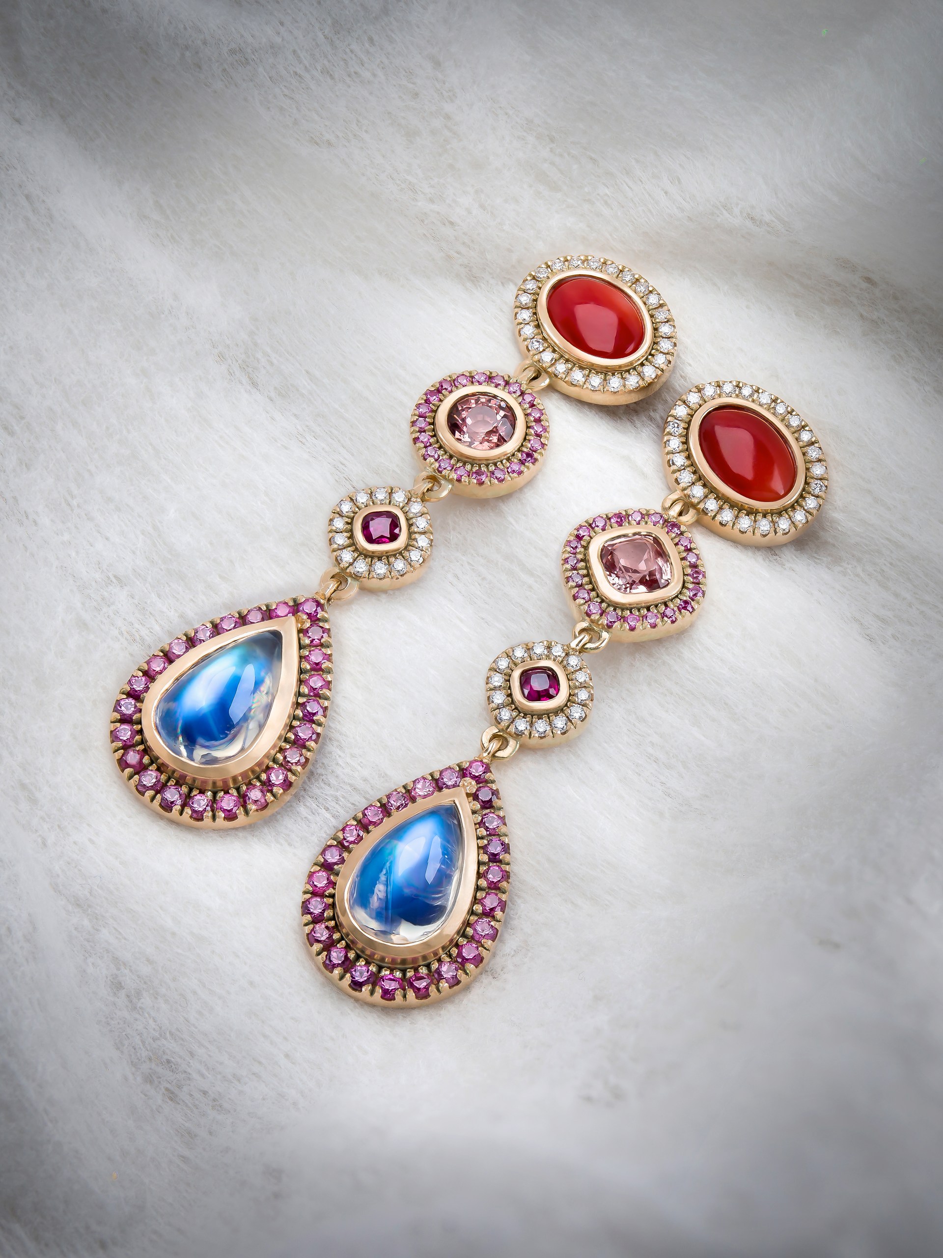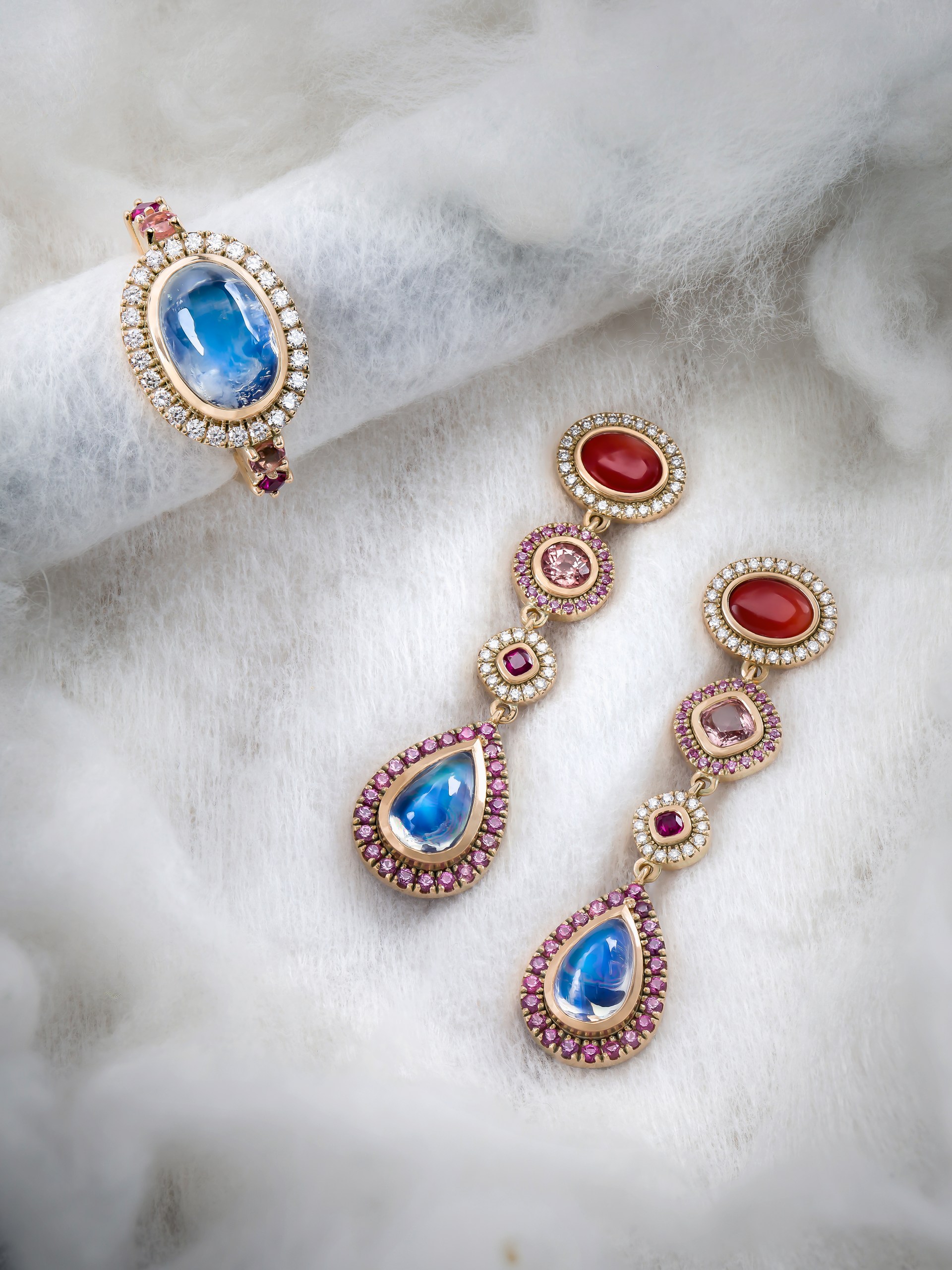 Серьги в желтом золоте с горячей эмалью и адулярами. Вставки: адуляры груша пара 3,84 карата, рубины пара 0,12 карата, шпинель 0,8 карата пара, красный японский коралл 0,9 карата пара, бриллианты 3/5 1мм 0,38 карата, рубины 1 и 1,5мм 1,12 карата. Вес серег 15,54 грамма. Кольцо в желтом золоте с адуляром, бриллиантами и горячей эмалью. Вставки: центральная вставка – адуляр 4,32 карата, боковые вставки – шпинели 0,3 карата, рубины 0,14 карата, бриллианты 3/5 1,5мм - 0,4 карата; Вес кольца 10,05 гр.