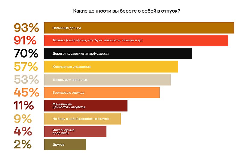 Этим летом в отпуск отправились 69% россиян. Подавляющее большинство из них (91%) берут с собой ценные вещи. В списке лидеров — наличные (93%), техника (91%), дорогая косметика (70%) и ювелирные украшения (57%).