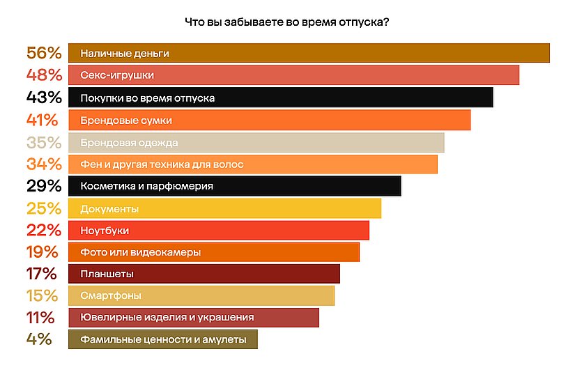 Самые опасные места для ценностей — это пляжи (43%), кафе и рестораны (33%) и клубы (29%). Зато в море ценности тонут редко — об этом сообщили всего 3% опрошенных. Чаще всего россияне теряют наличные, секс-игрушки и покупки, совершённые во время отдыха.