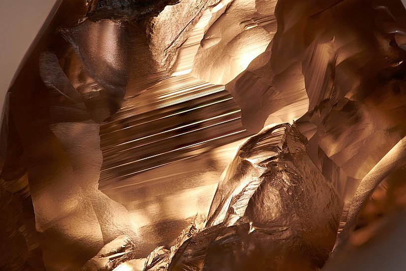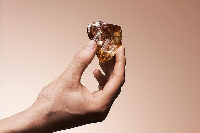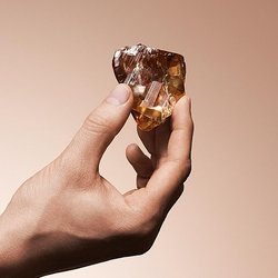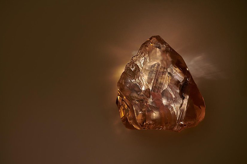 Цветные алмазы, особенно крупных размеров, встречаются значительно реже бесцветных и высоко ценятся на мировом рынке за свою уникальность. Янтарный оттенок этого кристалла делает его еще более исключительным.