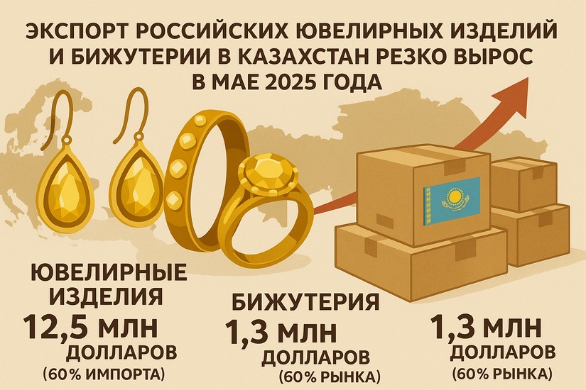 В мае 2025 года Россия значительно нарастила поставки ювелирных изделий и бижутерии в Казахстан. По данным РИА Новости, экспорт ювелирных украшений из драгоценных металлов увеличился в 2,5 раза по сравнению с аналогичным периодом прошлого года, а поставки бижутерии — почти вдвое.