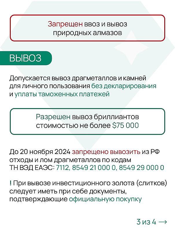 Бриллианты: разрешён вывоз бриллиантов стоимостью не более 75 000 $.