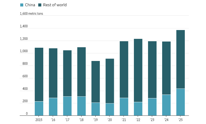 Цифры: В 2025 году на долю Китая пришлось более 400 метрических тонн чистого спроса в представленном сегменте. Это значительно превышает показатели любого другого года начиная с 2015-го.
