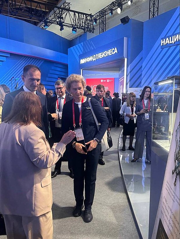 Выставка «Национальный стиль в ювелирном искусстве», организованная Министерством финансов РФ и Фондом развития художественной промышленности и ювелирного искусства, стала важной частью культурной программы форума. Она приурочена к 195-летию со дня рождения великого русского ювелира Павла Овчинникова. Президент Фонда Галина Ананьина лично провела экскурсию для Юрия Зубарева, что подчеркивает важность диалога между представителями финансового сектора и сферы искусства.