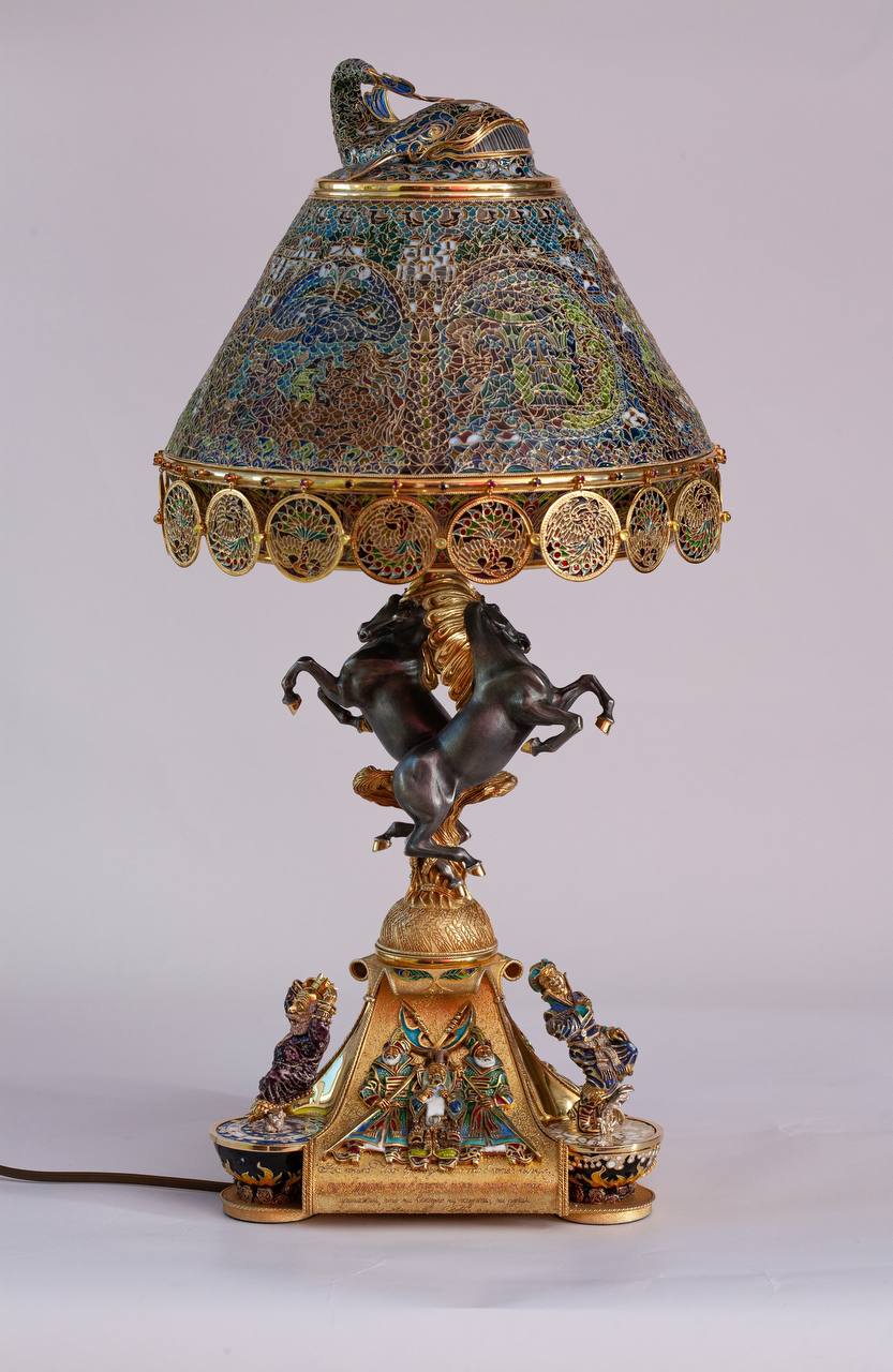 Этот уникальный экспонат, на создание которого ушло более десяти лет кропотливого труда, выполнен по мотивам сказки Петра Ершова «Конёк-Горбунок». Лампа изготовлена из золота 999 пробы и серебра 925 пробы и украшена сапфирами, рубинами и хризолитами.