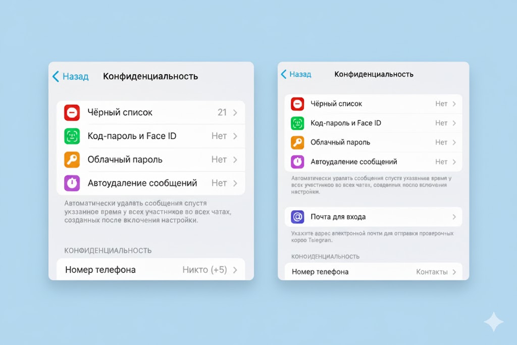 Эта комбинация (активные сессии + email для входа + облачный пароль) гарантирует, что вы всегда сохраните доступ к своему аккаунту, независимо от работы мобильных операторов.