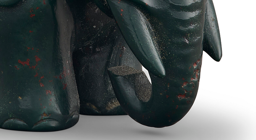 This time, buyers are offered a hardstone carving of an elephant made from bloodstone (heliotrope) with ruby eyes. The lot is estimated between $20,000 and $30,000. The auction house supports the item's authenticity with provenance: stating that the Aitken family purchased the figure in the 1960s from a "reputable antique dealer" in New York.