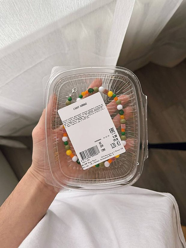 Особого внимания заслуживает упаковка. Бренд решил сыграть на ностальгии и реализме: колье продается не в бархатной коробочке, а в пластиковом контейнере из кулинарии — точно таком же, в котором продают салаты в супермаркетах.