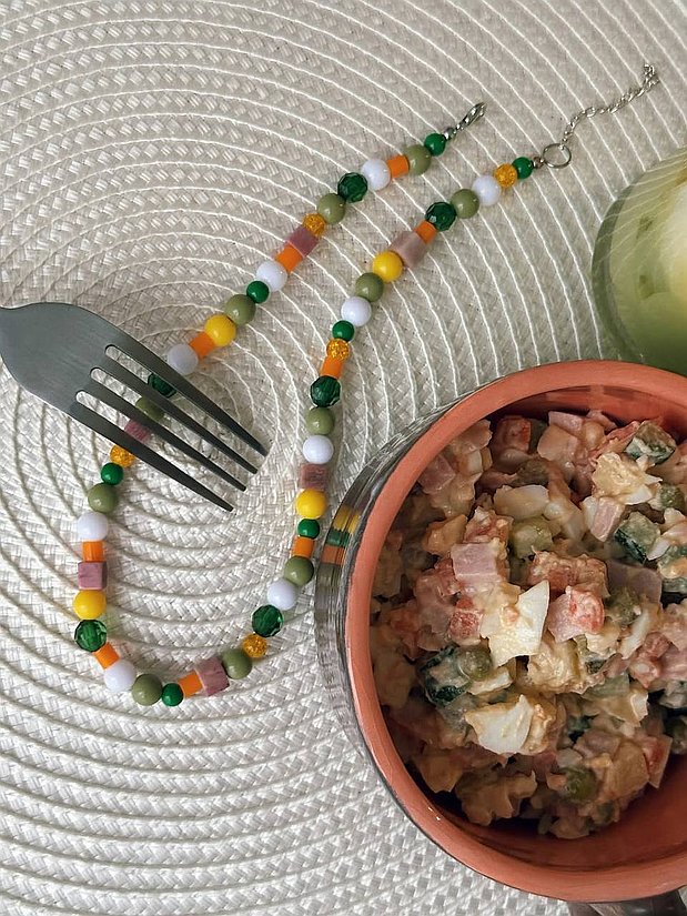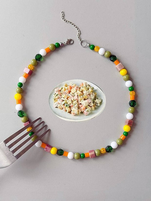 Овощи и майонез: Остальные компоненты — горошек, морковь, картофель, яйца и огурцы — заменяют разноцветные бусины из акрила и чешского стекла.