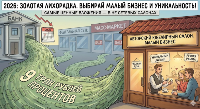 Самое время вспомнить цифру с графика: около 9 трлн рублей — это только выплаченные проценты по вкладам за 2025 год! Это фантастическая ликвидность. Если хотя бы 5-10% этой суммы перетечет на рынок «твердых ценностей» (золото, бриллианты), ювелирный рынок ждет взрывной рост.