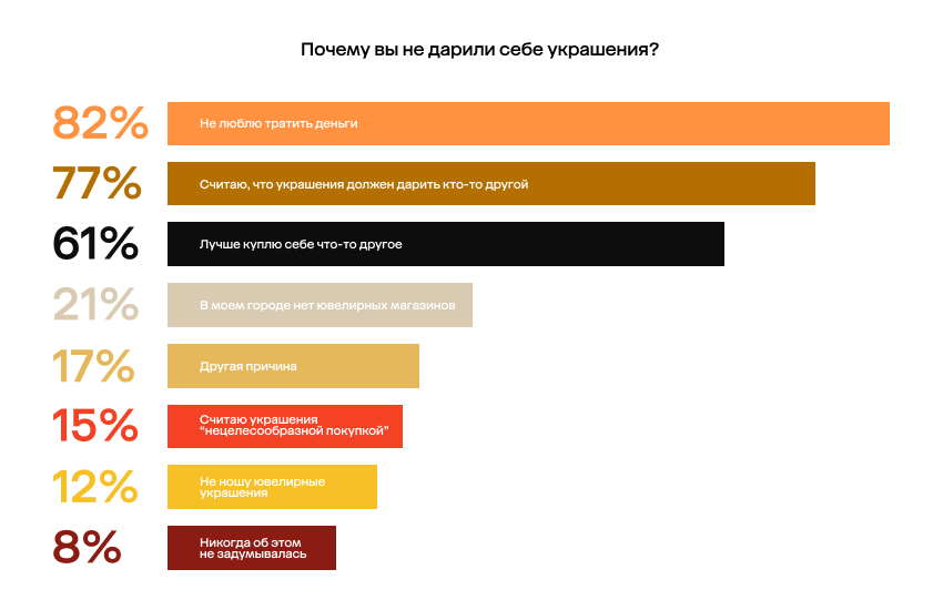 Основные причины, по которым женщины отказываются от самостоятельных покупок, — это нежелание тратить деньги на себя (82%), желание получить украшение именно в подарок (77%) и предпочтение более бюджетных вариантов (61%).
