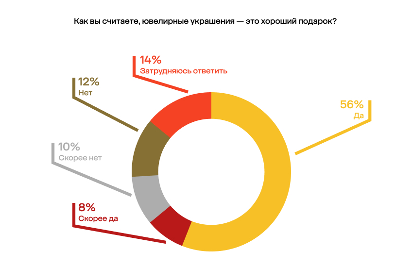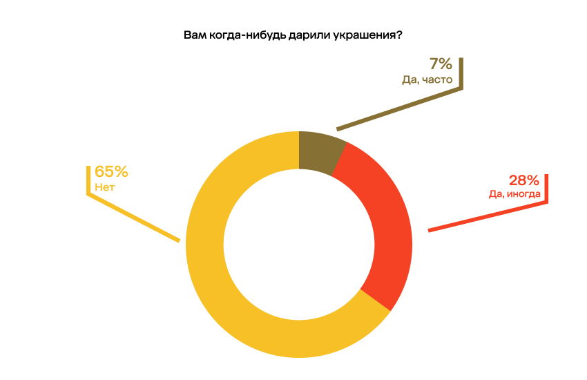 Гипотеза о том, что ювелирные изделия — это традиционно подарок, подтверждается ещё одним фактом: 84% респонденток не отказались бы от дорогого украшения, если бы его преподнёс близкий человек. Подавляющее большинство (53%) хотели бы получить такой презент от партнёра, 35% — от родственников, 10% — от друзей. И лишь 2% женщин не важно, от кого получать ювелирку.