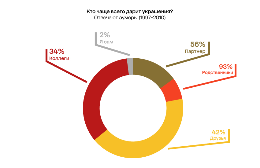 Интересно, что у зумеров иное видение: 42% из них хотели бы получить ювелирный подарок от друзей, а 34% — от коллег. Это говорит о том, что для поколения Z украшения — не только "особенный" подарок от близкого человека, но и универсальный презент. Они меньше ориентируются на устаревшие стереотипы и больше ценят собственные чувства и желания.
