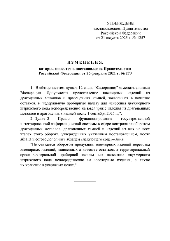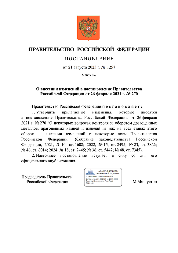Это решение закреплено в постановлении Правительства РФ от 21.08.2025 № 1257, подписанном Председателем Правительства М. Мишустиным. Документ вносит изменения в постановление от 26 февраля 2021 г. № 270, которое регулирует оборот драгоценных металлов и камней.