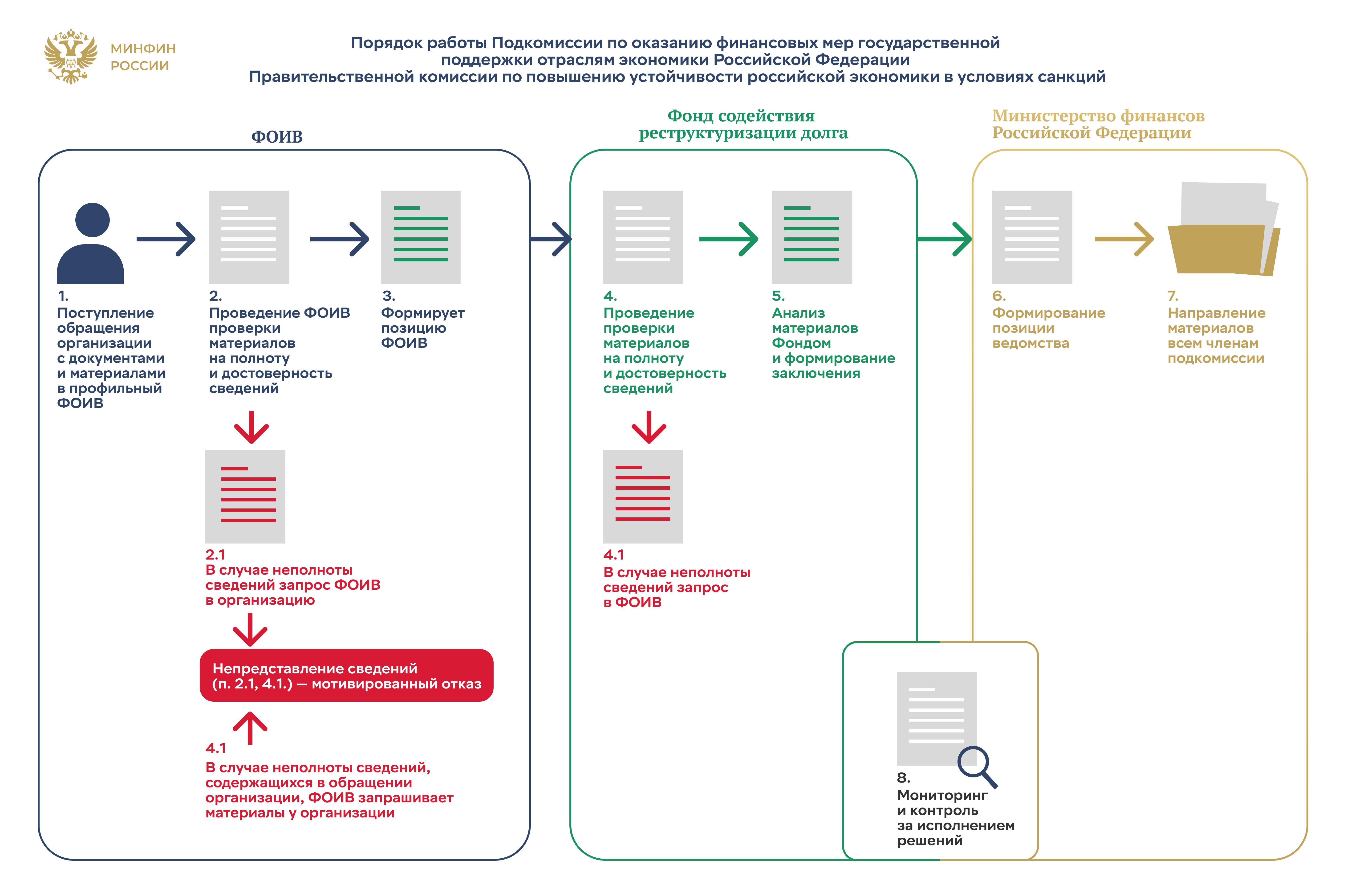 Федеральный орган исполнительной власти проводит проверку обращения и материалов на соответствие критериям и полноту сведений. В случае положительного решения, обращение направляется в Фонд содействия реструктуризации долга, который проводит дальнейший анализ и формирует заключение. Все материалы затем передаются членам Подкомиссии для рассмотрения и принятия решения.