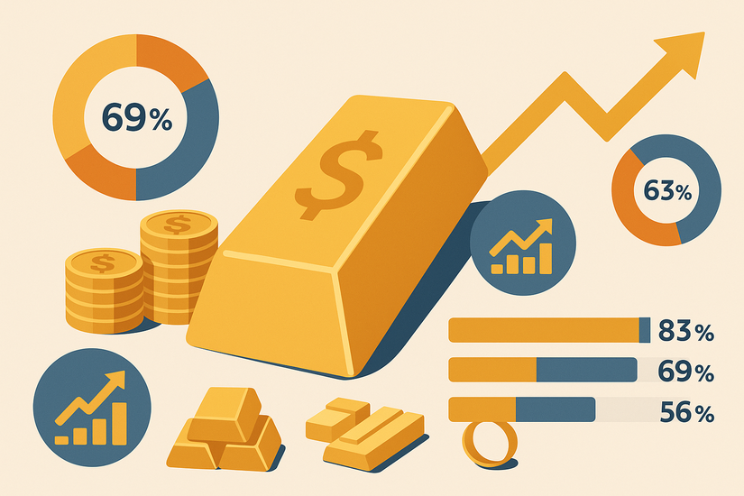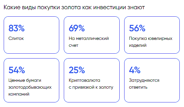 Наиболее известными способами покупки золота как инвестиции являются слитки (83%), металлические счета (69%) и ювелирные изделия (56%). Ценные бумаги золотодобывающих компаний знают 54% респондентов, а криптовалюту с привязкой к золоту — 25%.