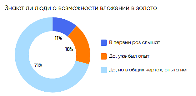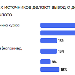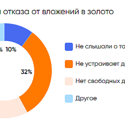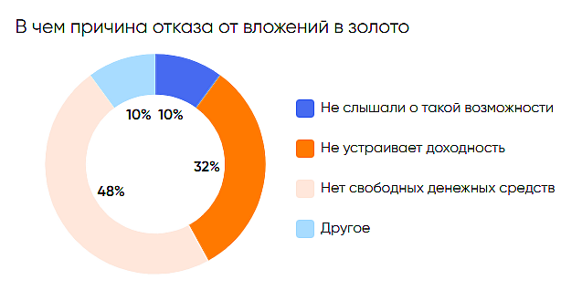 Среди причин отказа от вложений в золото 48% респондентов назвали отсутствие свободных денежных средств, а 32% не устраивает доходность. 10% опрошенных не слышали о такой возможности.