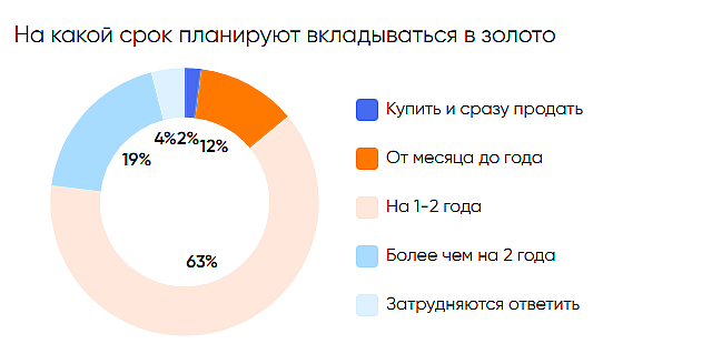 Примечательно, что большинство инвесторов ориентированы на долгосрочные вложения в золото: 63% планируют держать актив более двух лет, а еще 19% — от одного до двух лет. Это подтверждает восприятие золота как стабильного, а не спекулятивного инструмента.