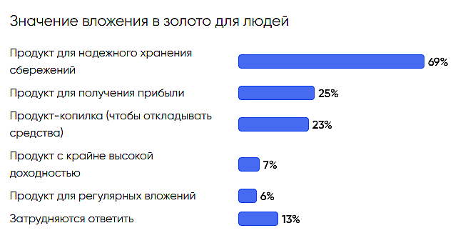 Исследование показало, что подавляющее большинство россиян (69%) рассматривают вложения в золото как способ надежного хранения сбережений. Получение прибыли является мотивацией для 25% опрошенных, а 23% используют золото как способ накопления средств. Лишь 7% респондентов считают золото продуктом с крайне высокой доходностью.