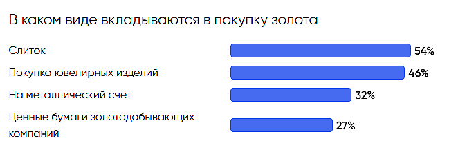 Фактически же россияне предпочитают инвестировать в слитки (54%) и ювелирные изделия (46%). Металлические счета используют 32% опрошенных, а ценные бумаги золотодобывающих компаний — 27%.