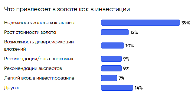 Главным фактором, привлекающим в золото как в инвестиции, является его надежность как актива (39%). Рост стоимости золота интересует 12%, а возможность диверсификации вложений — 10%.