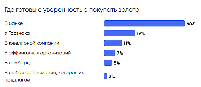 Что касается мест покупки, то большинство респондентов (56%) готовы с уверенностью покупать золото в банке. Заметно меньше доверяют Госзнаку (19%), ювелирным компаниям (11%), аффинажным организациям (7%) и ломбардам (5%).