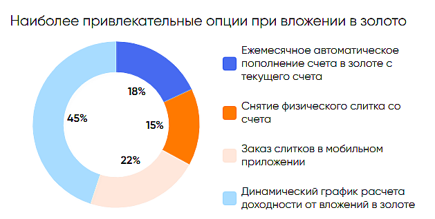 Наиболее привлекательными опциями при вложении в золото являются динамический график расчета доходности от вложений (45%) и ежемесячное автоматическое пополнение счета в золоте с текущего счета (22%). Снятие физического слитка со счета интересно 18%, а заказ слитков в мобильном приложении — 15%.