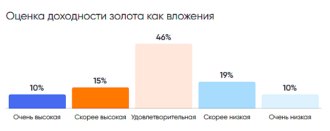 Оценка доходности золота в целом умеренная: 46% считают ее удовлетворительной, 15% — скорее высокой, и 10% — очень высокой. В то же время 19% оценивают доходность как скорее низкую, и 10% — как очень низкую.