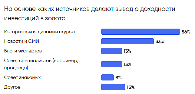 При принятии решения о доходности инвестиций в золото россияне в основном опираются на историческую динамику курса (56%) и новости/СМИ (33%). Блоги экспертов и советы специалистов (например, продавцов) влияют на 13% опрошенных.