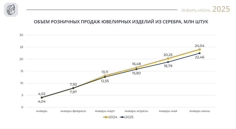 Согласно представленным данным, общий объем розничных продаж серебряных украшений в первой половине 2025 года составил 22,46 млн штук. Это значительно меньше показателя за тот же период 2024 года, который достиг 24,04 млн штук.