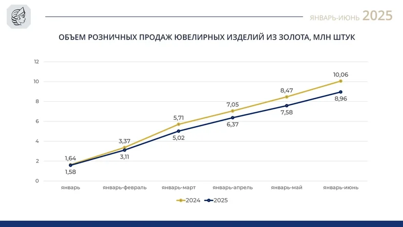 Синяя линия, представляющая 2025 год, показывает, что к концу июня 2025 года общий объем розничных продаж золотых ювелирных изделий достиг 8,96 миллиона штук. Однако, золотая линия, представляющая 2024 год, демонстрирует, что за аналогичный период (январь-июнь) 2024 года было продано 10,06 миллиона штук. Это означает, что в первой половине 2025 года рынок пока не достиг объемов продаж предыдущего года.