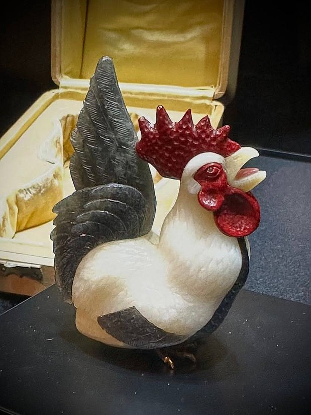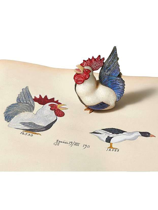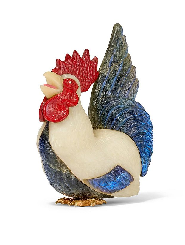 Особую интригу торгам придает тот факт, что некоторые предметы, изображенные в альбоме, представлены здесь же «во плоти». Ярчайший пример — редкая камнерезная фигурка Петушка (Cockerel), созданная около 1911 года.